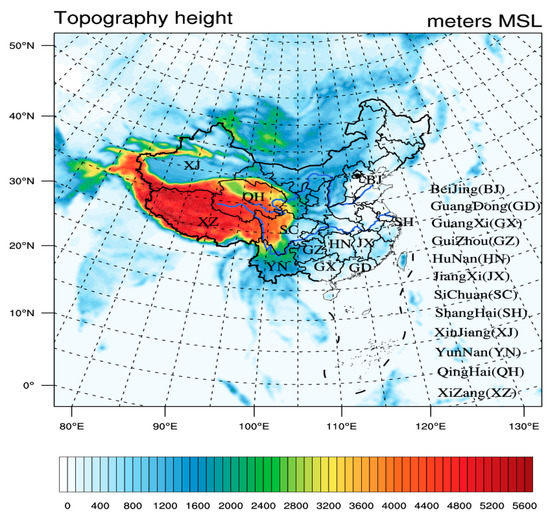 The WRF model is used with the Advanced Research WRF (ARW) dynamic core version 3.7 in this study [47]. The model domain is centered at 35° N and 105° E with 220 × 260 horizontal mass grids points at 30 km spacing (Figure 1); it encompasses all of continental China. The Lambert conformal conic projection is used for the model horizontal coordinates. In the vertical dimension, 38 terrain-following eta levels are used from the surface to 10 hPa. Initial and boundary conditions for the large-scale atmospheric fields, as well as initial soil parameters (soil water, moisture, and temperature) are given by the 0.703° ERA-Interim datasets. The domain lateral boundary is composed of a one-point specified zone and a four-point relaxation zone. The main physical options used include the WRF double-moment 6-class (WDM6) microphysical parameterization [48], the community atmosphere model (CAM) longwave and shortwave radiation [49], Yonsei University planetary boundary layer scheme [50], the unified Noah land-surface model [51], Kain-Fritsch cumulus parameterization scheme [52], and community Land Model version 4.5 lake scheme [53,54].