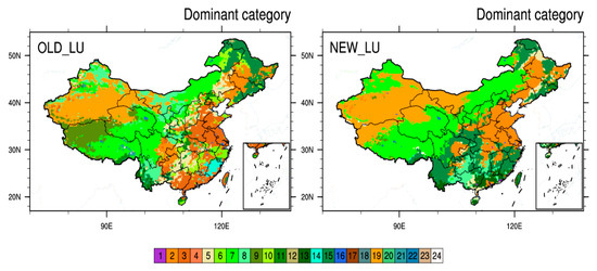 The Weather Research and Forecasting (WRF) model is one of the most widely used regional climate models in dynamical downscaling. It includes two default land use datasets. The first is the Advanced Very High Resolution Radiometer (AVHRR) land use data product developed by the U.S. Geological Survey (USGS) between April 1992 and March 1993, which includes 24 USGS categories [38]. The second is the MODIS land use data product, which was developed at Boston University between January and December 2001 and includes 20 categories developed by the International Geosphere-Biosphere Programme (IGBP) [39]. As mentioned above, the accuracy of these land use data products in China is relatively low [40,41,42]. Wu et al., noted that land use and land cover has changed significantly across China since the beginning of the 21st century [43]. The default vegetation fraction of the WRF model is derived from the 5-year AVHRR normalized difference vegetation index (NDVI) climatology, which covers the period from 1985 to 1990 at a resolution of 0.144° [44]. Zhao et al., found that the vegetation fraction over China has changed dramatically in recent years [45]. Li et al., found that compared with the MODIS remote-sensing vegetation fraction, the WRF default vegetation fraction, which was estimated in northeastern China, is becoming gradually less representative [46]. The studies discussed above show that the land surface characteristics given by the default land use and vegetation fraction data of the WRF are no longer particularly representative over China.
