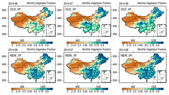 where i represents one pixel and NDVIS and NDVIV represent the pure pixel NDVI values of barren soil and vegetation, respectively. In the actual calculation, because most of the pixels are mixed pixels, which represent a variety of vegetation types, the calculated vegetation fraction represents the total effect of multiple vegetation types. Therefore, the values of NDVIS and NDVIV affect the accuracy of the vegetation fraction. The NDVIS and NDVIV values were preset according to Zeng et al. [57] and Miller et al. [58]. Figure 3 shows the distribution of the default WRF (Figure 3 OLD_VF) and updated dynamically accordant vegetation fraction values (Figure 3, NEW_VF) at the model resolution. The vegetation fraction estimated by the MODIS product is higher than that in the WRF default data, especially in southern and northeastern China. These are consistent with the actual land use changes and in agreement with the results of Zhang et al. [56] and Li et al. [46]. The proportions of OLD_VF and NEW_VF at different vegetation fraction levels are shown in Table 3.