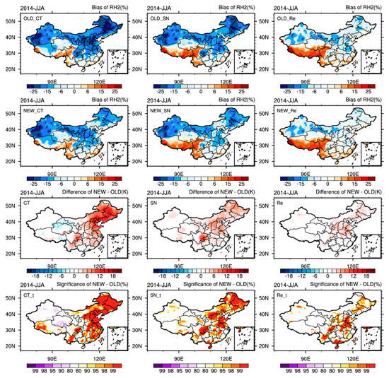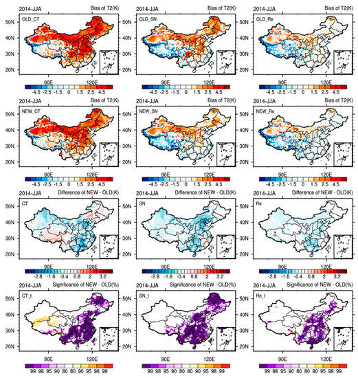 Bias distribution of the daily averaged temperature (T2) in summer 2014. The first row (continuous integration (CT), spectral nudging (SN), and re-initialization (Re); OLD_CT, OLD_SN, OLD_Re) contains the OLD group, the second row (NEW_CT, NEW_SN, NEW_Re) contains the NEW group. The third row (CT, SN, Re) is the difference between simulation of NEW and OLD group. The last row (CT_t, SN_t, Re_t) is the statistical significance of the difference between NEW and OLD group for each grid 92-day simulations of temperature correspond to CT, SN, and Re, respectively. The left (OLD_CT, NEW_CT, CT), middle (OLD_SN, NEW_SN, SN), and right (OLD_Re, NEW_Re, Re) columns correspond to the CT, SN, and Re simulations, respectively.