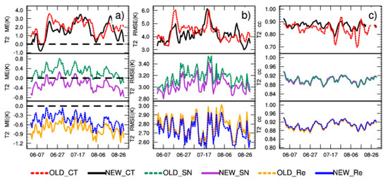 Time series of spatial ME (a); root means square error (RMSE) (b); and cc (c) for daily 2 m temperature in the summer of 2014 over China. The top (NEW_CT, OLD_CT), middle (NEW_SN, OLD_SN), and bottom (NEW_Re, OLD_Re) rows correspond to the CT, SN, and Re simulations, respectively.