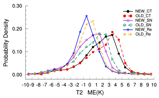 In order to quantitatively describe the surface temperature downscaling performance in different experiments, the daily time series of the spatial ME, RMSE, and cc were compared. Figure 5 shows the spatially averaged daily variations of 2 m temperature during the summer of 2014 in different experiments. Meanwhile, this section provides the statistical significance of the difference between OLD and NEW group, SN and Re methods. The results show that the Re method has smallest RMSE (Table 4), followed in order by the SN and CT downscaling methods. Figure 5a shows that changes in the ME and CT method simulations overestimate temperature; this positive bias is reduced in the SN method. Updating the land surface information (NEW) reduces the temperature simulation RMSE in CT and SN dynamical downscaling methods (Table 5). The surface energy balance is also affected by the surface roughness, reflectivity, and emissivity through their effects on turbulence and surface heat flux; the underlying surface condition determines the surface roughness, reflectivity, and emissivity. Because the initial reflectivity is determined by the static land surface data in WRF, changes in land use and vegetation fraction primarily affect emissivity. Updating the land surface information increases the vegetation fraction, such that the emissivity increases and the net radiant energy on the surface is reduced. With the increased surface roughness of the mixed forest, wind speed decreases, turbulence weakens, heat exchange weakens, and the sensible heat flux decreases. The probability density distribution (Figure 6) also confirms this observation.