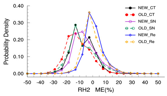 Statistical tests allow more detailed examination of the downscaling performance of the three methods. Figure 8 shows daily variations in the mean 2 m relative humidity for the summer of 2014 in different experiments. Figure 9 shows the probability density of the daily relative humidity ME for the summer of 2014 in China. A conspicuous negative ME exists in the CT simulation; the ME values are slightly negative in the SN and Re simulations, but to a lesser degree than that in the CT method. Comparing the three methods, the ME is minimized in the Re simulations, in which it is closer to 1. Comparing the OLD and NEW results, the relative humidity of the simulation increases with the increase in vegetation fraction arising from the updated land surface information, ameliorating most of the negative ME values. Figure 8b shows an RMSE time series in which the CT method has the maximum RMSE, with a mean RMSE (OLD_CT) of 24.034% (Table 6); the SN mean RMSE (ODL_SN) is reduced, at 19.539%. The Re RMSE (OLD_Re) is the smallest, at 15.966%. The introduction of the updated land surface information obviously improves the CT and SN methods (Table 7), which have RATE values (NEW_CT and NEW_SN) of 15.38% and 11.55%, respectively. There is no clear improvement in the Re method, for which the RATE value (NEW_Re) is 4.92%. The cc results echo the ME and RMSE results. In the Re method, the spin-up time is short due to the frequent updating of initial information. Thus, the effect of the land surface information on the climate field is not cumulative, and the land surface information has little effect on the Re method.