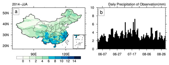 Spatial distribution with time-averaged (all days) (a) and times series with spatial-averaged (all grid points) (b) of daily accumulated precipitation from observation data in summer, 2014.