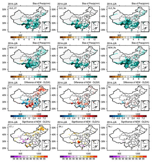 In this section, the spatial distributions and temporal variations of total daily accumulated precipitation (mm/day) are described. Figure 10 shows the observed spatial distributions and temporal variations of diurnally averaged precipitation during the summer of 2014 over China (Figure 10a,b). The daily precipitation presents obvious features, showing abundant precipitation in the south and scarce precipitation in the north. Precipitation is less than 6 mm north of the Yangtze River and 6–10 mm south of the Yangtze River, with individual areas featuring more than 10 mm. Figure 11 compares simulated diurnally averaged precipitation bias from the three methods using OLD and NEW land surface data during the summer of 2014 over China. The mean diurnal characteristics of precipitation are captured well north of the Yellow River, but somewhat overestimated south of the Yellow River. China is located in the Asian monsoon region, and the monsoonal circulation plays an important role in the transport of water vapor. Thus, the distribution of seasonal precipitation is strongly influenced by the Asian monsoon. Precipitation is also significantly affected by the large terrain; seasonal precipitation in China has long challenged meteorologists due to the complexity of the East Asian topography. Of the three methods, the CT and Re methods overestimated precipitation in the eastern TP, Northeast Plain, and Hunan Jiangxi province junction. The Re method clearly overestimated precipitation in the eastern TP, while the CT method clearly overestimated precipitation in the Hunan Jiangxi province junction. However, mean precipitation is realistically simulated by the SN method, which produces only a small positive bias in the southwestern region. The SN provides large-scale flow consistent with the large-scale reanalysis circulation, which prevents the model results from drifting away from the large-scale circulation above the boundary layer and shows advantages for precipitation simulation. The Re method frequently updates the ICs and LBCs with more detailed topography and performs reasonably well in downscaling surface parameters. Updating the land surface information does not adjust the large-scale circulation field, so these updates do not improve precipitation caused by large-scale circulations. The Re simulation runs with a shorter spin-up time, subdivide some parameters, which generally have long memory (such as soil parameters) from a long simulation into shorter ones. This problem should be addressed in the design of optimal re-initialization spin-up times.