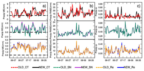 Time series of spatial ME (a); root means square error (RMSE) (b); and cc (c) for daily accumulated precipitation in the summer of 2014 over China. The top (NEW_CT, OLD_CT), middle (NEW_SN, OLD_SN), and bottom (NEW_Re, OLD_Re) rows correspond to the CT, SN, and Re simulations, respectively. 2014.