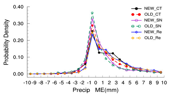 Relationships between verification parameters and observations are shown in Figure 12. Figure 13 shows the probability density of the daily accumulated precipitation ME. Table 8 shows a summary of the ME, RMSE, cc, and RATE for daily accumulated precipitation in summer 2014 over China. The CT runs feature the maximum RMSE (OLD_CT/NEW_CT) (Figure 12b, Table 8), while the Re method overestimates precipitation during all of the experiments (Figure 12a). Compared to the CT and Re methods, the SN simulations show minimal RMSE and the highest correlations with observed data (Table 8), and, therefore, outperform the other downscaling methods for daily mean precipitation. This is consistent with the spatial distribution results discussed earlier. In these tests, there is no obvious change between the NEW and OLD groups in the precipitation simulation (Figure 13, Table 9).