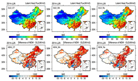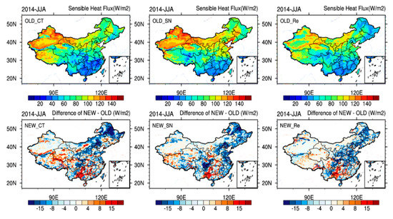 The land surface energy balance is significantly affected by the land surface initial information, and surface latent heat flux and sensible heat flux are important components of the surface energy balance. Surface energy balance is reflected in changes in mean surface sensible heat flux and latent heat flux. Therefore, these variables can be explored to gain a better understanding of the effect of updating land surface information on the surface energy balance in different downscaling methods. Figure 14 shows three-month (JJA-2014) average sensible heat flux (W m−2) from the OLD model simulation and differences with the corresponding NEW model simulations in the three downscaling methods. In the different downscaling methods, the sensible heat flux is similar to the general trend, but differences exist in many areas. In the Xinjiang and northeast China regions, the SN sensible heat flux exhibits a larger order of magnitude, followed in order by the CT and Re methods. South of the Yangtze River, the sensible heat flux magnitudes simulated by the SN and Re methods are similar, and that simulated by the CT method is small. There is a change in the sensible heat flux after updating the land surface information. The sensible heat flux variation trends are similar in the different downscaling methods, but the magnitude variation differs in different regions. For instance, in northeastern China, the land surface information update leads to an increased vegetation fraction and the sensible heat flux is decreased; these changes are most obvious in the CT method (Figure 14, NEW_CT), followed by the SN (Figure 14, NEW_SN) and Re methods (Figure 14, NEW_Re). However, in the northwestern TP, in which the land surface information update changes the land categories from mixed shrubland/grassland (categories 9) to barren or sparsely vegetated (categories 19) areas, the sensible heat flux is increased in the CT and Re methods, with the clearest increases in the CT method. In the northeast part of the Yunnan province, where shrubland (categories 8) are transformed into mixed forest (categories 15), the sensible heat decreases; in the southern Guizhou, where the broadleaf forest (categories 12) changes to shrubland (categories 8), the sensible heat flux increases. In the Sichuan province, a large area of cropland and pasture (categories 3) changes to broadleaf (categories 13), the vegetation fraction is increased, and the sensible heat is reduced.