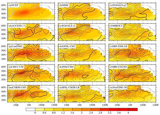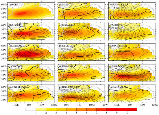 Winter North Pacific Storm Track (WNPST) climatology (Shading) and the difference between each model and NCEP reanalysis (contour, with an interval of 0.5, black bold line represents the contour with the zero value) (unit: K∙ms−1). The value is not shown in blank areas to avoid data contamination by terrain effect.