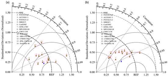 Taylor diagrams of (a) WNPST Climatology and (b) interannual variation of its amplitude.