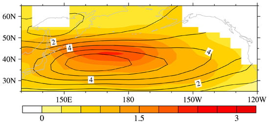 Characteristics about MST variability have been substantially revealed in previous studies. It has been proposed that two wave guides exist in the strong baroclinic region in mid-latitude North Pacific for transporting synoptic scale vortices [], which is consistent with the recent finding of double storm tracks in the lower troposphere []. Nakamura [] demonstrated that seasonal variation of MST exhibits a “midwinter suppression” feature. In decadal scale, some previous studies indicate variation of MST is a response to ENSO []. Nakamura et al. [] found interannual variation of MST is related to anomalous winter monsoon and the strength of its corresponding East Asia jet as well as heat transport of stationary/transient wave.