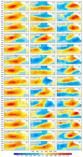However, many uncertainties still exist in the models, and large model bias is one of the common features for all the models. Besides, there are significant differences among models. Therefore, evaluating the capability of models in simulating the storm track and analyzing model biases is crucial for the application of models to the prediction of storm tracks variability and the response to climate change. The outputs from the latest climate system models for Coupled Model Intercomparison Project (CMIP) phase 5 (CMIP5) have been extensively investigated and compared with the earlier CMIP3 results []. Compared with CMIP phase 3 (CMIP3) models, CMIP5 models have higher resolution and better representation of the earth system []. Chang et al. [] evaluated 23 models in simulating the storm track based on CMIP5 outputs and compared the results with those from 17 models in CMIP3 []. The comparison revealed that the climatology of storm track in most of CMIP5 models is weaker and the simulated storm track is closer to the equator than that in the CMIP3 models. Possible implications of model biases in storm-track climatology have been investigated by Chang et al. [], and they found that biases in storm-track amplitudes in general circulation model simulations are not primarily due to horizontal resolution. With 12 CMIP5 models and ERA-Interim data, Booth et al. [] examined interaction of surface storm tracks and western boundary current. As for under a global warming climate, the weaker the simulated climatology of storm track, the more uncertainties of the projected climate of the middle 21th century (2041–2060), and for the Northern Hemisphere, the models project some poleward shift and upward expansion of the storm track in the upper troposphere, but mainly weakening of the storm track toward its equatorward flank in the troposphere [].