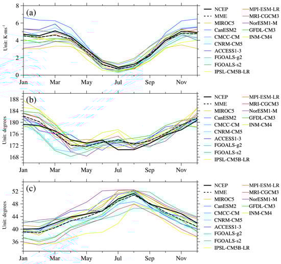 Figure 6 shows time series of climatological mean monthly WNPST strength index, longitude index and latitude index during the period 1955–2004. According to NCEP reanalysis (Figure 6a), significant seasonal variation of WNPST strength index is evident, and it is the strongest in winter and the weakest in summer with a minimum in July. It exhibits a bimodal curve which the strongest months are in November and March, representing a “midwinter suppression” effect. CMIP5 models are able to simulate the monthly variation of WNPST strength index. The discrepancies among the 13 models are the smallest during May–October, with the magnitude of the difference less than 1 K∙ms−1. The difference between the models and NCEP reanalysis is also smaller during this period. However, large discrepancies still exist among the models for the other months, with the magnitude of the difference greater than 3.5 K∙ms−1. It can also be found that only MIROC5, CNRM-CM5, FGOALS-g2, MPI-ESM-LR and GFDL-CM3 can reproduce the “midwinter suppression” effect. Though NorESM1-M also shows a bimodal curve, one of the peaks occurs in April rather than March. CMMCC-CM, ACCESS1-3 and IPSL-CM5B-LR can only generate the peak in March correctly, while the single peak in INM-CM4 occurs in November. On the other hand, the WNPST strength index is the strongest in spring in CanESM2, FGOALS-s2 and MRI-CGCM3. According to above analysis, we believe these models can somehow simulate the monthly variation of WNPST strength though only less than half of all the models can generate acceptable simulations. Nevertheless, the MME of strength index shows much better results, it can not only represent “midwinter suppression”, but also has similar magnitude to NCEP reanalysis and shows consistent variation, it is superior to all the single models.