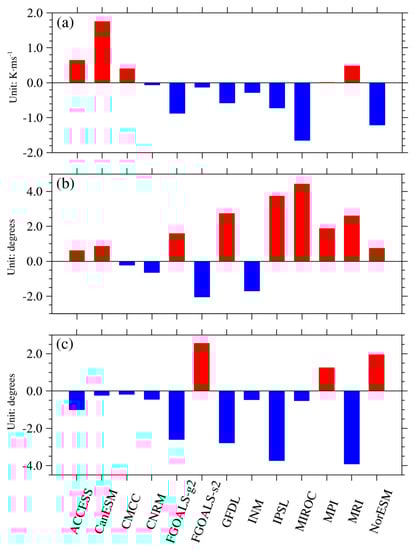 The major differences among the strength indices from these 13 models are in winter. Figure 7a shows the differences of winter climatological mean of strength index between these models and NCEP reanalysis. It is easy to find that the strength index is smaller in winter in most of the models. Specifically, the strength index from MIROC5 shows a negative bias of 1.6 K∙ms−1, while the strength index in CanESM2 shows a positive bias of 1.7 K∙ms−1. CNRM-CM5, FGOALS-s2 and MPI-ESM-LR show relatively smaller biases. The strength index from MPI-ESM-LR is very close to that from NCEP reanalysis, indicating this model can reproduce WNPST strength.