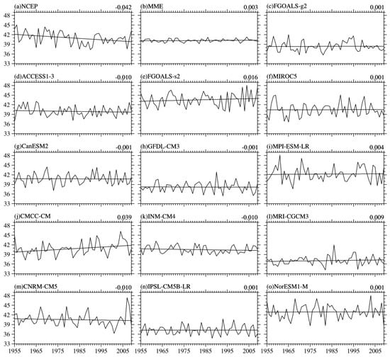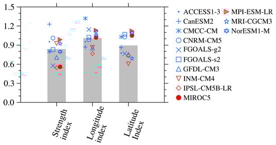 In order to further evaluate the capability of each CMIP5 model in simulating strength and location of WNPST, a couple of WNPST indices are introduced in this paper. We adopted the method proposed by Li et al. [] which can represent the WNPST dynamically and quantitatively. Specifically, we set a threshold which is the median of WNPST strength of all the grids within a domain (25°–65° N, 130° E–120° W). By doing so, the number of grids is same for all the samples, and WNPST is well represented by the selected grids. The mean of the values greater than this threshold in all the grids is defined as strength index of WNPST, conveniently, the average longitude/latitude is defined as longitude/latitude index. Strength, longitude and latitude index are expressed as follows: