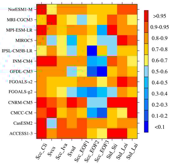 Diagram indicating the relative ability of (top to bottom) the CMIP5 models in simulating the climatology and interannual variability of WNPST (Scc_Cli, Scc_Iva, Scc_EOF1, Scc_EOF2 and Scc_EOF3 on horizontal axis represents spatial correlation coefficients (Scc) of climatology (Cli), interannual variation of amplitude (Iva), the first mode (EOF1), the second mode (EOF2) and the third mode (EOF3) respectively; Svcs, Svsd, Std_Sti, Std_Loi and Std_Lai represents capability of model in simulating the spatial variation of climatology strength (Svcs), standard deviation (Svsd), and the interannual variability (Std) of the WNPST strength index (Sti), longitude index (Loi) and latitude index (Lai) respectively (represented by 1-deviation)).