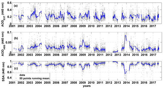 - Andrews, E.; Ogren, J.A.; Kinne, S.; Samset, B. Comparison of AOD, AAOD and column single scattering albedo from AERONET retrievals and in situ profiling measurements. Atmos. Chem. Phys. 2017, 17, 6041–6072. [Google Scholar] [CrossRef]