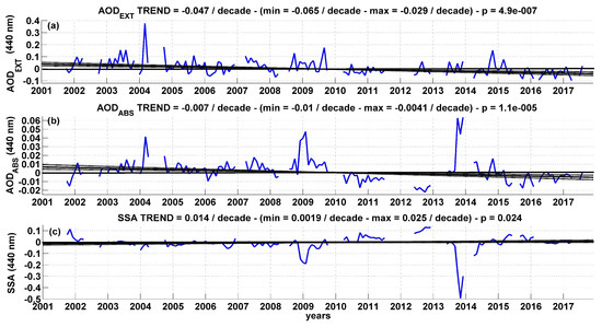 - Li, J.; Carlson, B.E.; Dubovik, O.; Lacis, A.A. Recent trends in aerosol optical properties derived from AERONET measurements. Atmos. Chem. Phys. 2014, 14, 12271–12289. [Google Scholar] [CrossRef]
