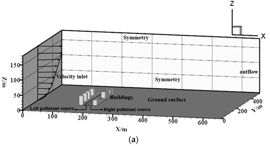 represents the pollutant concentration (kg/m3), represents the pollutant emission rate (kg/m3 s). represents the turbulent eddy diffusivity of pollutants. Here , represents the turbulent eddy viscosity, represents the turbulent Schmidt number, which represents the ratio of momentum diffusivity and mass (or pollutants) diffusivity. Here we use = 0.7 according to Hang et al. [43].