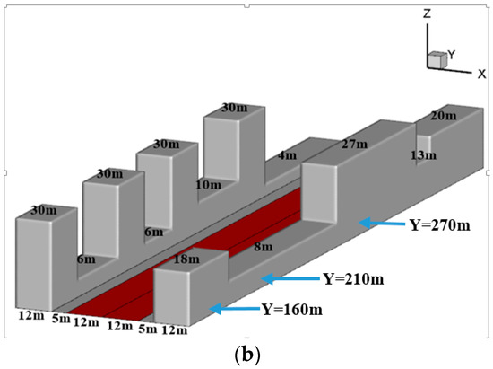 Street canyon model (a) computing domain model and the boundary conditions; (b) building geometric structure.