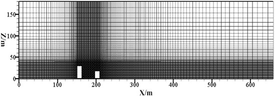 Computational area discretization is a critical step in computational fluid dynamics. In general, for the same meshing zones, the hexahedral (HEX) meshing method is more economical and is more efficient at reducing false dispersion than the tetrahedral method. Thanks to the support of Gambit software and grid adaptive technology, the fine grids near the building walls and ground surfaces are particularly concentrated in these locations compared to places that are not proximal to walls or surfaces. This method can save computing resources in case of limited computer hardware, and obtain accurate flow field, concentration field, and other characteristics in the shortest amount of time. Figure 3 shows a schematic of the grid demarcation in a cross-section.