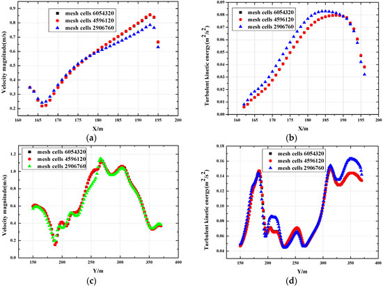 To capture the effects of grid independence to simulate the results, for this study, three types of grids (numbers 2906760, 4596120, and 6054320) were selected and calculated with the same computer under the same working conditions (wind speed v = 1.5 m/s, perpendicular to the street, and a source ratio of R = 2/1). We then selected a specific point in the computing domain, and found wind speeds of 1.571 m/s, 1.593 m/s, and 1.610 m/s under the three different grid numbers. The concentration levels of pollutants were 8.06 × 10−9, 7.84 × 10−9, and 7.67 × 10−9, respectively. In addition, the velocity magnitude and turbulent kinetic energy profile at a height of 2 m along the Y = 160 m section and the street centerline were compared in Figure 4. As can be seen from the figure, the maximum error appears at the turbulent kinetic energy profile at Y = 350 m, about 6%. Apart from this, Other errors are less than 5%. These results showed that further increasing the number of grids does not lead to apparent deviations of velocity and pollutant concentration, thus demonstrating precision of the numerical solution and irrelevance of the number of grids. The grid independence test results provide a good foundation for the remainder of the paper. Thus, mesh cells 4596120 were selected as the basic mesh system of this study.