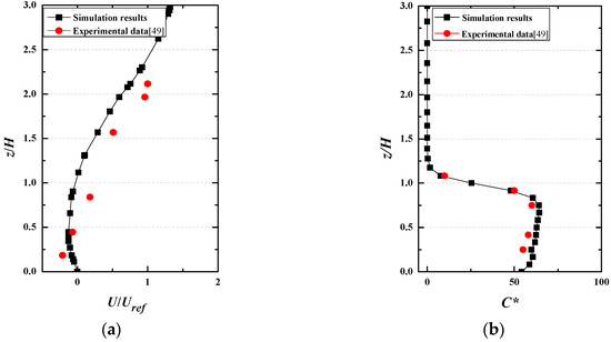 Using the same geometry and boundary conditions, we used the RNG k-ε numerical model for numerical calculation and compared the obtained results to experimental data. Vertical distributions of the streamwise velocity and normalized mean concentration at X/H = 0.50 are shown in Figure 5. Figure 5 shows that numerical simulation results of normalized mean concentration agree well with the experiment data. However, there is a small deviation in the vertical distribution of the streamwise velocity. The main reason may be due to the flow generated by the vortex generators in the wind tunnel experiment, which differs from the wind flow in the numerical simulation. Despite some slight differences, the RNG k-ε turbulence model is feasible for solving fluid flow and pollutant dispersion.