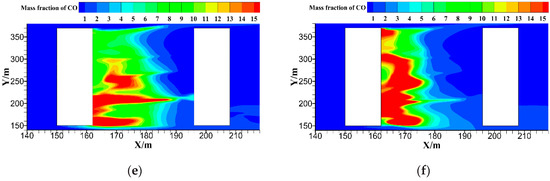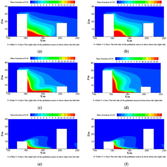 CO concentration field profile (10−9) in three different sections at a wind speed of 1.5 m/s and emission ratios of R = 1/3 and R = 3. (a) Y = 160 m, R = 1/3; (b) Y = 160 m, R = 3; (c) Y = 210 m, R = 1/3; (d) Y = 210 m, R = 3; (e) Y = 270 m, R = 1/3; (f) Y = 270 m, R = 3.