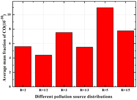 The average concentration of CO at pedestrian breathing height under different pollution source distributions.