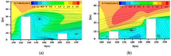 This phenomenon shown above is affected by flow field characteristics and the vortex intensity within the canyon. Figure 9a,b show the distribution of the streamlines in the street cross-section of Y = 210 m (typical step-up canyon) and Y = 270 m (typical step-down canyon) at a wind speed of 3 m/s. For the step-down canyon (Figure 9a), under the action of air transportation, CO accumulates in the leeward side of the street. Due to the increasing height of upstream buildings, the transportation ability of wind flow gradually decreases with increasing height in the leeward building surface. This leads to an accumulation of pollutants in the leeward side. For the step-up canyon (Figure 9b), a clockwise rotation vortex exists in the canyon due to the downstream building block air flow. The vortex center is located at half of the height of the downstream building. Under the action of vortex, the pollutants emitted by motor vehicles are transported from the windward side to the leeward side. Due to the relatively lower height of upstream buildings, CO can be quickly transported to the roof of the leeward surface, and will soon be diluted by the wind flow. The CO moving out of the canyon barely returns to the street. Thus, in the step-up canyon, the impact of the pollution source non-uniform distribution on the pollutant dispersion characteristics is no longer significant.