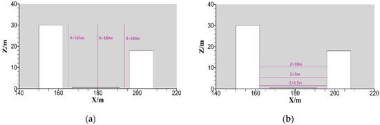 From the analysis in Section 3.1.1 and Section 3.1.2, it can be seen that both the pollution source distribution and the height variation of the buildings on both sides of the street influence the dispersion characteristics of the pollutant. To better understand the distribution of pollutants in the street space when the pollution source is non-uniform distribution, it is necessary to quantitatively analyze the pollutant concentration in the horizontal and vertical directions within the street canyon. However, due to the large computational domain, quantitative analysis is difficult to implement sequentially. Therefore, this paper selected the typical Y = 160 m cross-section in the street with the vertical direction X = 180 m (street center), X = 165 m, and X = 193 m (non-motorized road center in left and right side) and the horizontal direction Z = 1.5 m, Z = 5 m, and Z = 10 m as shown in Figure 10, to plot CO concentration curves at a wind speed of 1.5 m/s and wind direction 90°. Then, the distribution characteristics of CO in the horizontal and vertical street space were analyzed.