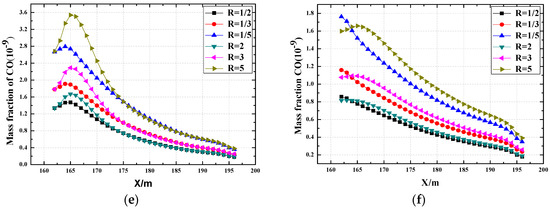 CO concentration field profiles (10−9) in the street space for different pollution source distributions under a wind speed of 3 m/s. (a) R = 1/2; (b) R = 2; (c) R = 1/3; (d) R = 3; (e) R = 1/5; (f) R = 5.