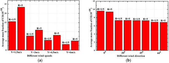 The above analyses about the dispersion characteristics of CO in the street canyon under non-uniform distribution of pollution source are based on a relatively low wind speed and for when the wind direction is perpendicular to the street. Therefore, it is necessary to analyze whether the influence of a non-uniformly distributed pollution source on the dispersion characteristics of pollutant remains significant under different wind speed and wind direction. We employed the pollution source emission ratios R = 1/5 and R = 5, wind speeds of V = 1.5 m/s, V = 3 m/s, V = 4.5 m/s, and V = 6 m/s, and a wind direction of 90° to analyze the impact of wind speed. Also, the pollution source emission ratios R = 1/5 and R = 5, wind speed V = 3 m/s, and wind direction 0°, 30°, 45°, and 60° were employed to analyze the impact of the wind direction. Then, the average concentration of CO at pedestrian breathing height Z = 1.5 m under different cases are shown in Figure 12.