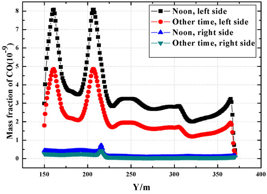 To analyze the influence of different pollution source intensities on the concentration of CO in the street, we employed the source intensity during noon (11:30–13:00) and other time (8:30–11:30 and 13:00–17:30) for the CFD numerical simulation. Then, the CO concentration levels along the center of two non-motorized lanes were plotted at a wind speed of 3 m/s. We mainly focused on the pedestrian breathing height of Z = 1.5 m. Through the field measurement we have obtained the source intensity during noon and at other times. These were 5.5 × 10−6 (kg/m3 s) and 3.3 × 10−7 (kg/m3 s).
