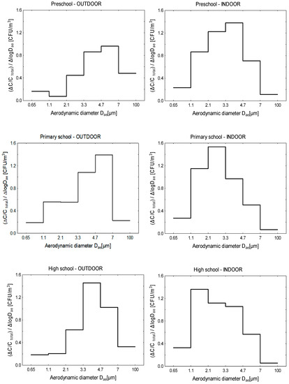 Size distribution of the bacterial aerosol in the outdoor and indoor air in preschool, primary school and high school; Dae—aerodynamic diameter; ΔC—concentration of bacterial aerosol on the particular stage of 6-stage Andersen impactor; Ctotal—total concentration of bacterial aerosol; Δ log Dae—logarithm of differences of cut-off diameters for a particular stage of 6-stage Andersen impactor.
