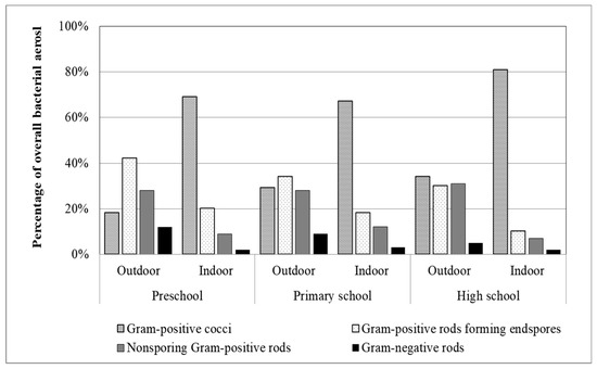 The microbiological indoor air quality of educational buildings is an important factor for children’s health because the school serves as their daily environment. The percentage composition of bacterial aerosols sampled in the studied educational buildings is shown in Figure 2. The results of bacterial species identification for aerosol in the indoor air revealed that the largest groups of bacteria were Gram-positive cocci. Gram-positive cocci were found to be the dominant bacteria group in primary schools in Edirne, Turkey [10], in schools in Ankara, Turkey [18], in Lublin, Poland [22], and in a child care center in Korea [51]. Quality characteristics of bacterial flora composition in university rooms in Poznań, Poland also showed a dominating contribution of Gram-positive cocci [53]. In turn, the most frequently isolated group of bacteria outdoors was Gram-positive rod-forming endospores, which is also in agreement with other reports [10,54,55].