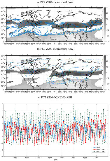 The first PC (PC1; 8% of total variance) that arose for the case of meridional wind speed component at 200 hPa (V200) was found to have a very good correlation with AIRI (