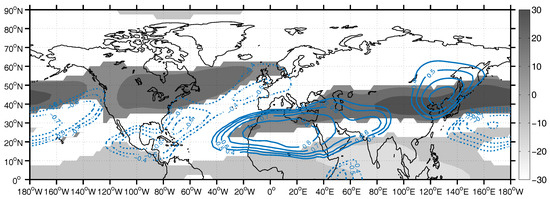32] for simplicity, with dark gray colors corresponding to westerlies and light gray colors to easterlies. The subtropical jet over central Asia and Europe is depicted, as well as the polar jet over N. America and the easterly jet over South Asia. For the case of Z200 PC2, the northern flanks of the wave disturbance lie over the mid-latitude westerlies and follow the movement of the subtropical jet over Eurasia and the polar jet over N. America and northern Atlantic, with a greater consistency over the Eurasia continent. The latter indicates the significant contribution of the subtropical jet stream in the development of the Rossby wave response in the extratropical latitudes [