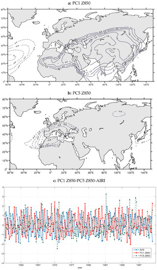 As for the zonal component of wind speed at 850 hPa (U850), nine principal components were retained, which share approximately 77% of total variance. Based upon the loadings of the first component of U850, which exhibited the strongest correlation with AIRI (