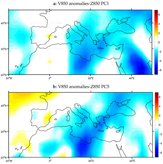 Figure 13). The two resulting anomaly maps exhibit similar patterns of northerlies over central and eastern Mediterranean, with the main difference that for the case of the PC1 composite map the strongest northerlies appear to be over the Middle East and secondary over the central and eastern Mediterranean and Libya, whereas in the case of the PC5 composite map only the northerly winds over the Aegean and Libya can be seen. The above findings point to the results of Tyrlis et al. [