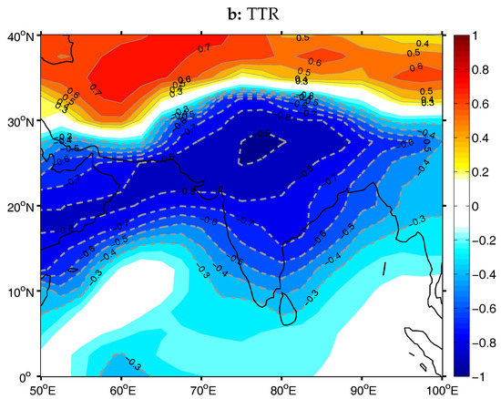 Figure 2b) reveals two distinct regions with opposite signs. One center of positive anomalies is found over the central and eastern Mediterranean, with maximum values over the Italian peninsula and the Adriatic Sea, whereas the center of negative values lies over NW India and the Himalayas, northern Arabian Sea as well as Pakistan and South Iran. The anomalous ascent over the Himalayas and Tibet region represents the orographic rainfall of the area. The specific pattern is in agreement with the results of Tyrlis et al. [