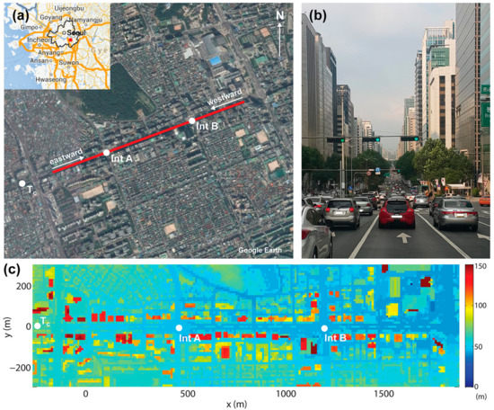 The study area of interest is a street canyon of eight-lane Teheran road with a southwest-northeast (i.e., 249° and 69° from the due north) orientation in a central business district of Seoul, which is a megacity in Republic of Korea (Figure 1a). The areas surrounding Teheran road are highly-developed commercial and residential areas, and a vegetated area is located in the north. Many high-rise buildings are densely located on both sides in the 1.8 km-long street canyon crossing with four-lane and six-lane roads at signalized intersections A and B, respectively (Figure 1b,c). The elevation of road gradually decreases from the southwest to the northeast by a few meters.
