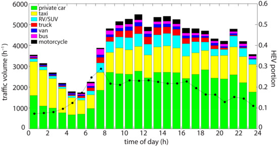 Hourly traffic volumes of private car, taxi, RV/SUV, truck, van, bus, and motorcycle and hourly HEV portion (black dot) counted at Tc for 72 h from 04:00 LT on 5 November to 04:00 LT on 8 November 2013.