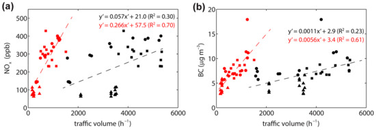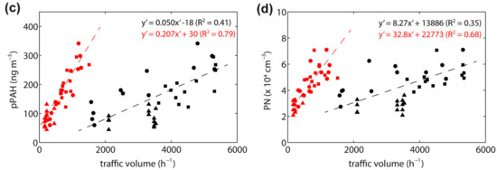 Scatter diagrams between measured (a) NOx, (b) BC, (c) pPAH, and (d) PN concentrations and total (black) and HEV (red) traffic volumes during mobile monitoring periods 1 (circle), 2 (square), and 3 (triangle) with linear regression lines for total (black dashed line) and HEV (red dashed line) traffic volumes, separately.