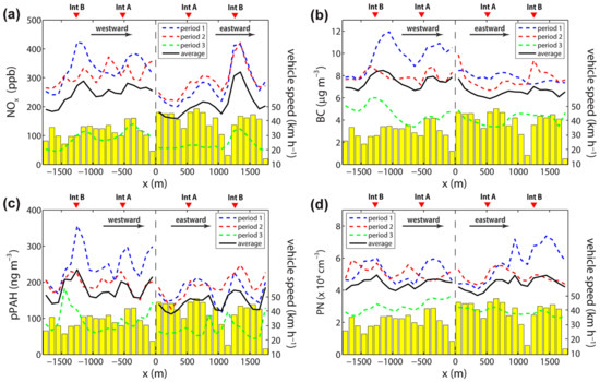 The on-road measurements of NOx, BC, pPAH, and PN concentrations during the three periods are divided into every two-way trip starting from the eastern end of the street canyon. Thirteen trips for each period are valid after excluding incomplete and interrupted measurements. In every trip, the median concentration is calculated in every 100-m section in the street canyon for each driving direction. A 100-m spacing is acceptable for studying the spatial variation of air pollutant near a major road [44]. For calculating the median concentration in a 100-m section, the measured concentrations with a vehicle speed higher than 20 km h−1 are used to avoid the effects of exhaust plumes of a vehicle directly ahead [45].