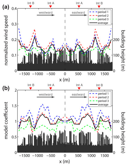 Scalar dispersion for the three different scenarios corresponding to mobile monitoring periods 1, 2, and 3 is numerically examined through the CFD model simulations with an identical distribution of on-road pollutant emission. Scalar dispersion has been commonly interpreted as dispersion of chemically inactive gases or ultrafine particles at small scale such as road environment [50]. Figure 5 shows the horizontal distributions of normalized on-road wind speed and pollutant concentration (hereafter, model coefficient) and of building height on the driving side in the street canyon for the three dispersion scenarios. The on-road wind speeds are normalized by the ambient (inflow) wind speed for each simulation. On the other hand, the on-road concentrations are normalized by the average on-road concentration over the three simulations. By doing this, the influence of ambient wind direction is included in both horizontal distributions of normalized on-road wind speeds and concentrations, whereas the influence of ambient wind speed is solely included in the horizontal distribution of normalized on-road concentrations. Therefore, the average of all the model coefficients for the three simulations is unity. The normalized on-road wind speed is generally higher for the period-1 and period-2 dispersion scenarios than for the period-3 dispersion scenario, since the ambient wind directions are fairly parallel to the canyon orientation for the period-1 and period-2 dispersion scenarios. The higher on-road wind speed for the parallel ambient wind directions is attributed to channeling flows that formed in the street canyon [51,52]. However, the normalized on-road pollutant concentration is higher for the period-1 and period-2 dispersion scenarios than for the period-3 dispersion scenario. This is because the emitted pollutants hardly escape from the street canyon for the parallel ambient wind directions. The ambient wind speed is slightly lower during periods 1 and 2 than during period 3, which also contributes to the inverse-proportional increase in on-road pollutant concentration. As a result, the ambient wind direction as well as the ambient wind speed is one of the determining factors in estimating the on-road pollutant concentrations in the street canyon. The normalized on-road wind speed is obviously high at the intersections where roadside buildings rarely obstruct lateral ventilation. The normalized on-road pollutant concentrations are consequently low at the intersections, particularly at intersection B wider than intersection A.