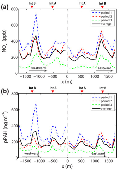 Horizontal distributions of converted (a) NOx and (b) pPAH concentrations during mobile monitoring periods 1 (blue dashed line), 2 (red dashed line), and 3 (green dashed line) and averaged over the three monitoring periods (black solid line).