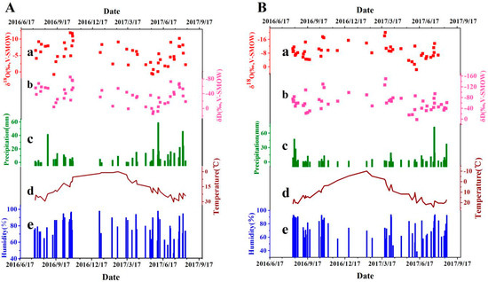 - Liu, J.R.; Song, X.F.; Sun, X.M.; Yuan, G.F.; Liu, X.; Wang, S.Q. Isotopic composition of precipitation over Arid Northwestern China and its implications for the water vapor origin. J. Geogr. Sci. 2009, 19, 164–174. [Google Scholar] [CrossRef]