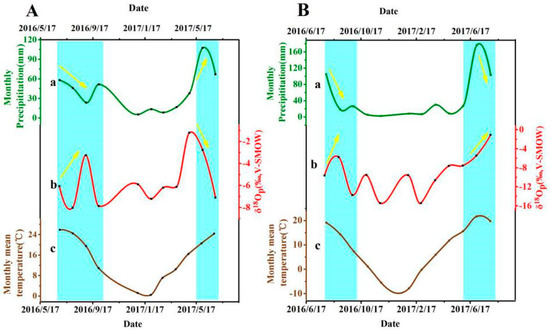 - Zhang, Y.H. Research into the relations between temperature and precipitation of δ18O stable isotope in the precipitation in Xi’an City. J. Baoji Univ. Arts Sci. (Nat. Sci.) 2015, 35, 58–62. (In Chinese) [Google Scholar]