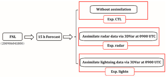 The first experiment was Exp. CTL, the baseline control experiment. It utilized the 0900 UTC (Universal Time Coordinated) forecast field which starts at 1800 UTC 4 June 2009, using the National Centers of Environmental Prediction (NCEP) Final Operational Global Analysis (FNL) data as the initial field, then forecast afterwards without any assimilation. The second experiment was Exp. radar, a radar assimilation experiment. It was based on the first experiment, Exp. CTL. It assimilated the observed radar reflectivity of the Hefei Doppler radar at 0900 UTC and then forecast afterwards. The third experiment was Exp. lightn, a lightning data assimilation experiment. It assimilated lightning-proxy radar reflectivity from the Anhui lightning location network at 0900 UTC based on Exp. CTL and forecast. The observed radar reflectivity or proxy radar reflectivity, which is converted from lightning location data was assimilated via 3DVar. Radar reflectivity can be directly assimilated into the WRF-3DVar system. It assimilates reflectivity via an operator to convert the model rainwater mixing ratio into reflectivity. A meaningful forecast rainwater field is difficult to obtain with a statistic background error covariance, which is utilized in the 3DVar framework [36,37]. Then, in its assimilating procedure, the total mixing ratio is utilized as the moist control variable. Then, warm rain microphysical processes are used to partition the total mixing ratio increment into the water vapor mixing ratio , cloud water mixing ratio and rainwater mixing ratio increments (the details can be found in [36,37] and the technical note on WRF-3DVar). The details of the designed experiments can also be obtained in Figure 1.